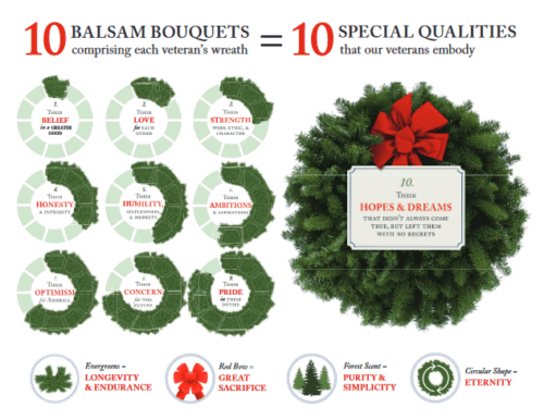 The veterans’ wreath consists of ten balsam bouquets, symbolizing ten qualities all veterans embody. The wreaths are tied with a red ribbon to symbolize a veteran’s sacrifice.