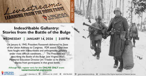 On January 6, 1945, President Roosevelt delivered his State of the Union Address to Congress. FDR stated, “Our men have fought with indescribable and unforgettable gallantry under most difficult conditions….” The President was describing the Battle of the Bulge. Join Virginia War Memorial Education Director Jim Triesler as he shares stories from participants in that great battle.